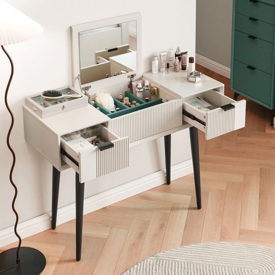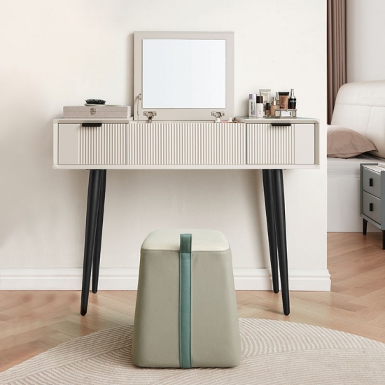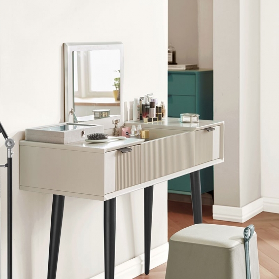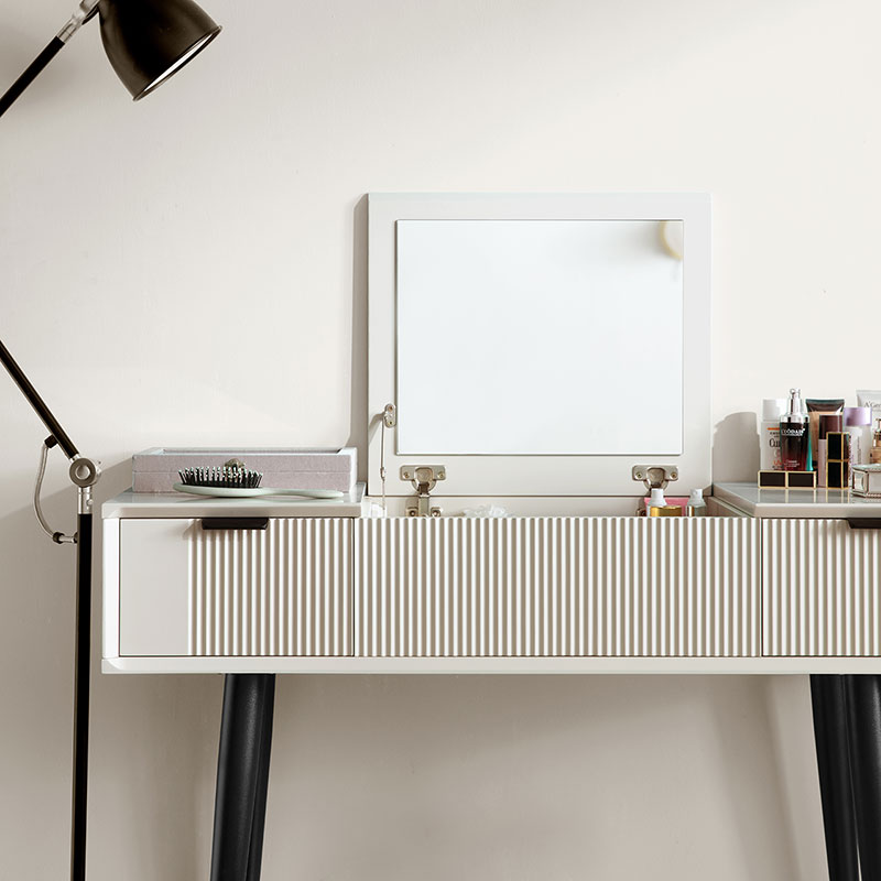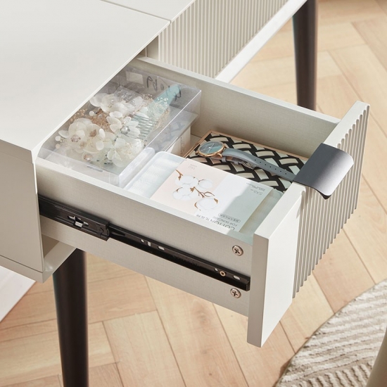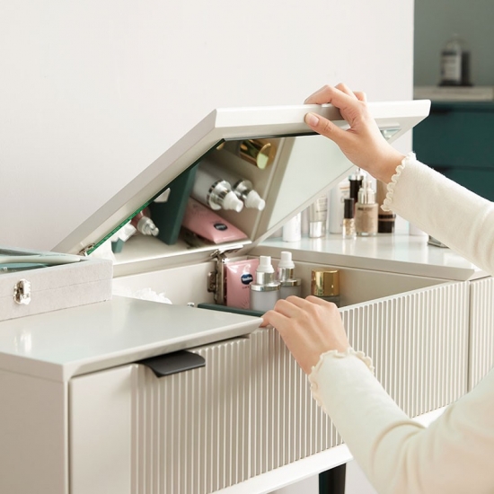 ยกตรงกลางโต๊ะเครื่องแป้งขึ้นเพื่อเผยให้เห็นกระจก และคุณจะพบว่ามีกล่องเก็บของที่ซ่อนอยู่มากมายสำหรับอัญมณีและเครื่องประดับของคุณ ชุดโต๊ะเครื่องแป้งนี้ทำจากแผ่นไม้ MDF ที่แข็งแรงและมีคุณภาพสูง ทนทานและแข็งแรง มาพร้อมกับสตูลบุนวมซึ่งสามารถให้ที่นั่งที่สะดวกสบายเมื่อคุณแต่งหน้า