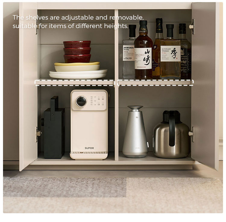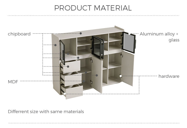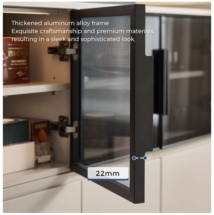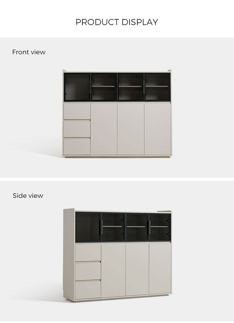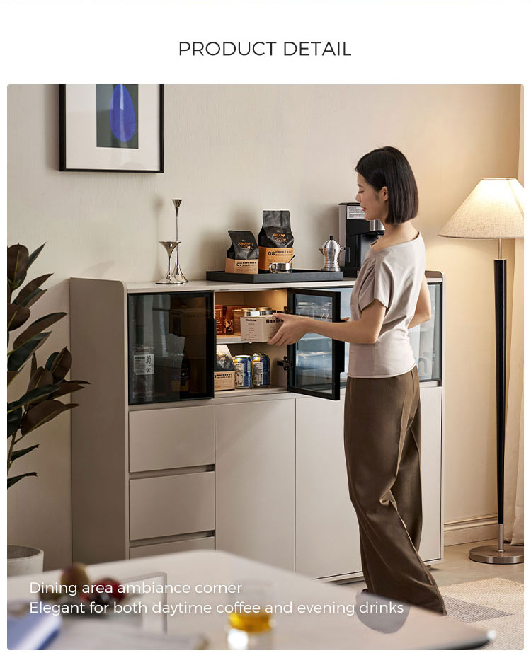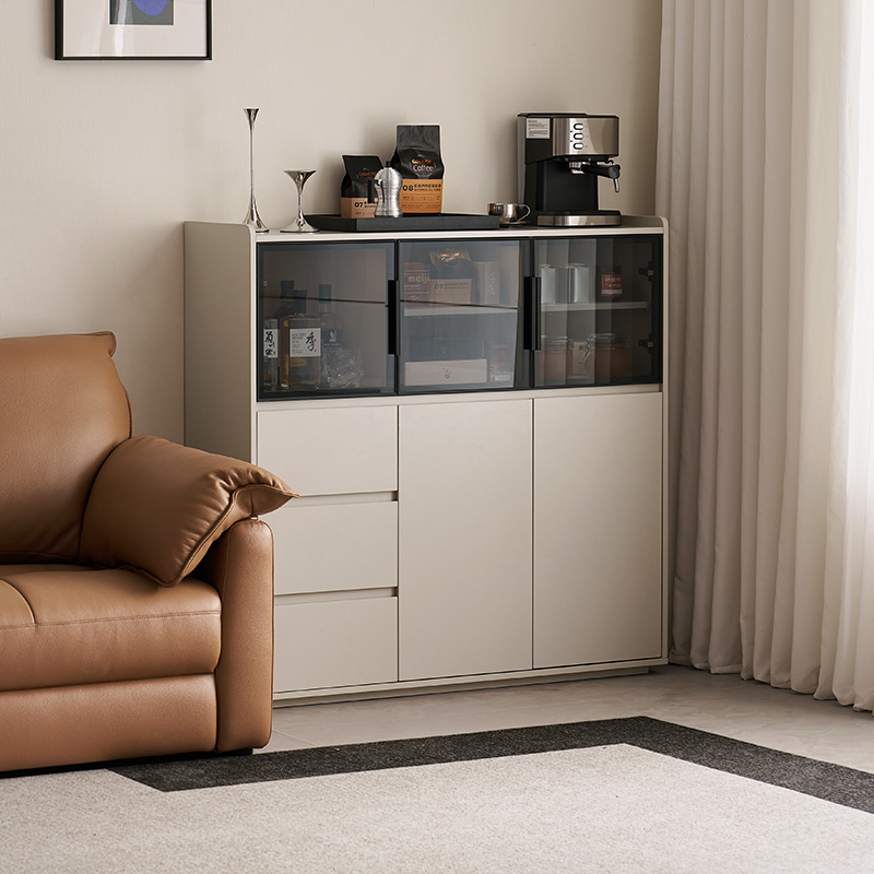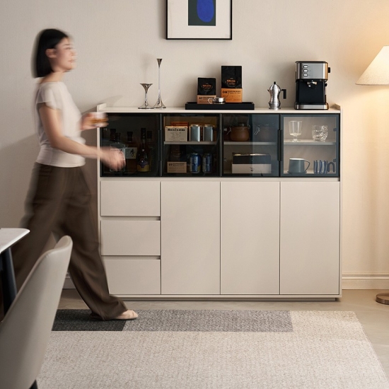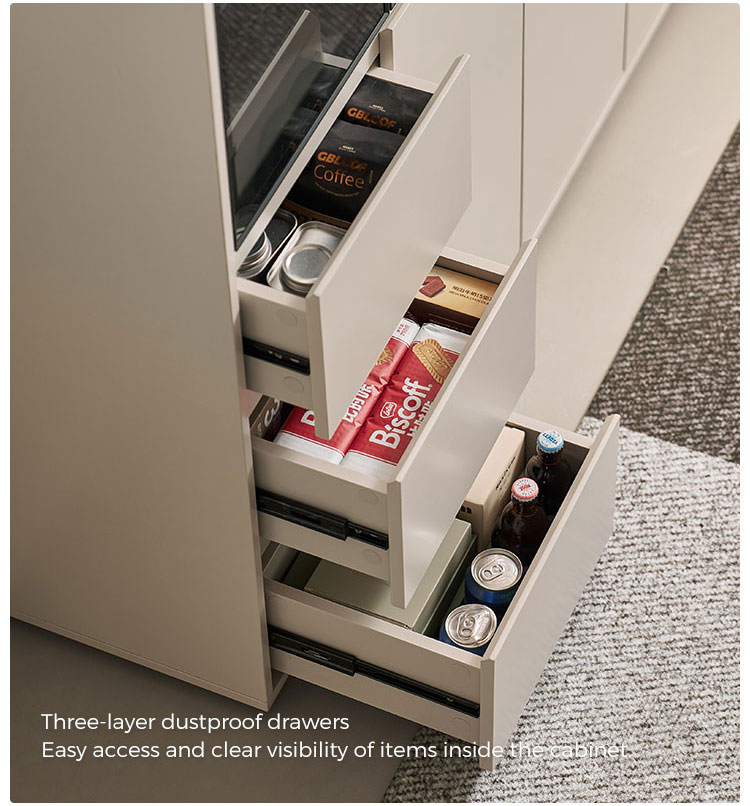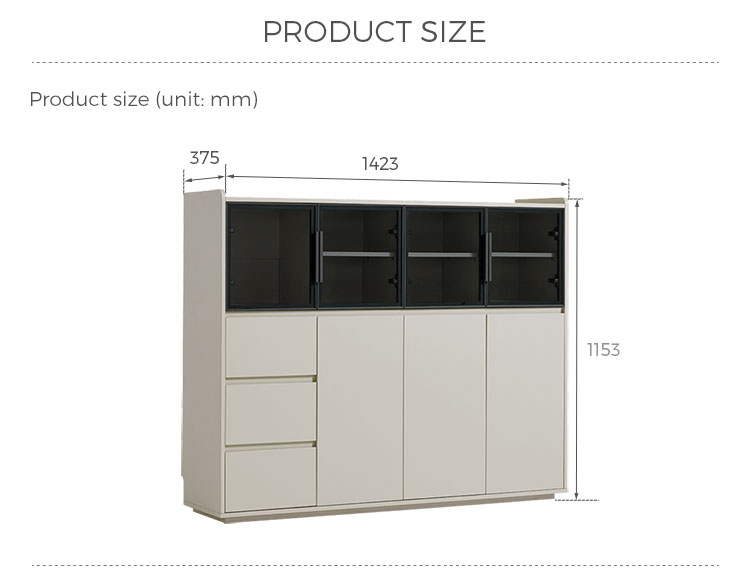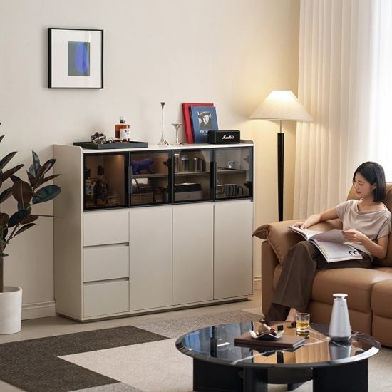 จุดเด่นอยู่ที่ประตูบานกระจกขนาดใหญ่ ซึ่งช่วยให้คุณจัดแสดงชุดจานชาม เครื่องแก้ว หรือของตกแต่งชิ้นโปรดได้อย่างมีสไตล์ พร้อมทั้งป้องกันฝุ่นละออง ทำให้ห้องดูโปร่งโล่ง นอกจากประตูบานกระจกแล้ว ยังมีลิ้นชักขนาดใหญ่หลายช่องที่ช่วยเสริมความเป็นระเบียบเรียบร้อยในการจัดเก็บสิ่งของต่างๆ ลิ้นชักเหล่านี้เหมาะสำหรับเก็บช้อนส้อม ผ้าปูโต๊ะ ของใช้ หรือของใช้จำเป็นในห้องนั่งเล่นได้อย่างเป็นระเบียบ ทำให้ทุกอย่างมีที่วางของตัวเอง