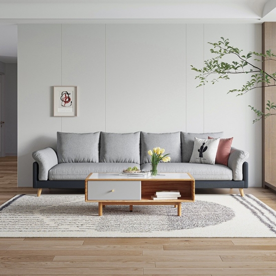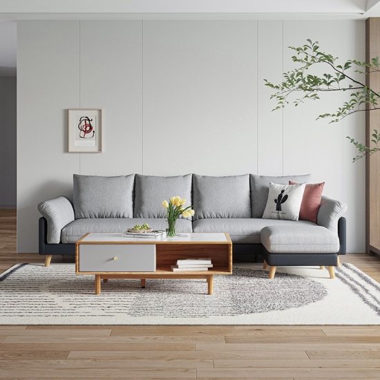 มีสไตล์แต่อบอุ่นสบาย นั่งลงในโซฟารูปตัว L ซึ่งมีโครงไม้โอ๊คเนื้อแข็งในรูปทรงที่ดูสะอาดตา เบาะรองนั่งบุขนนกและโฟมวางบนคอยล์สปริงเพื่อความสบายสูงสุด ในขณะที่เบาะที่มีประสิทธิภาพทำให้ชิ้นนี้ทนทานและสะดุดตาไม่แพ้กัน