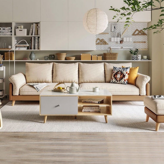 โซฟาโมเดิร์นยาว ต่ำ และออกแบบมาเพื่อการพักผ่อน เติมเต็มห้องนั่งเล่นร่วมสมัยด้วยสไตล์เรียบง่ายและโปร่งสบาย ไม้ที่มาจากแหล่งยั่งยืนพร้อมพื้นผิวสีอ่อน ผสมผสานระหว่างโซฟาม้านั่งแขนขวาและเก้าอี้แขนซ้ายพร้อมขาสี่เหลี่ยมและราวทั้งตัว