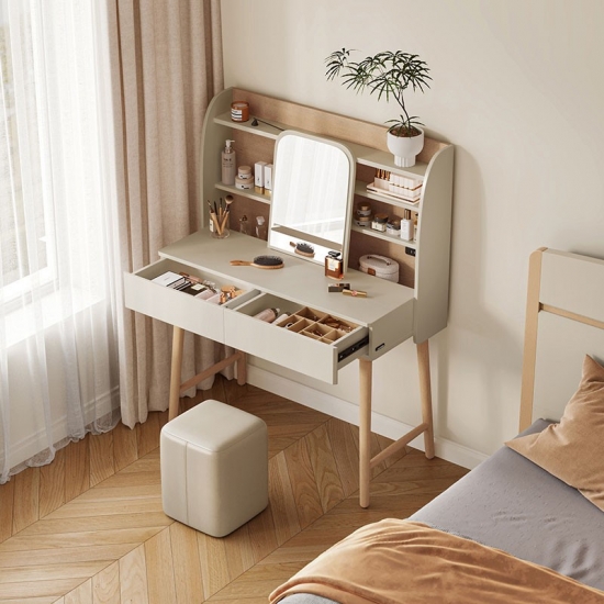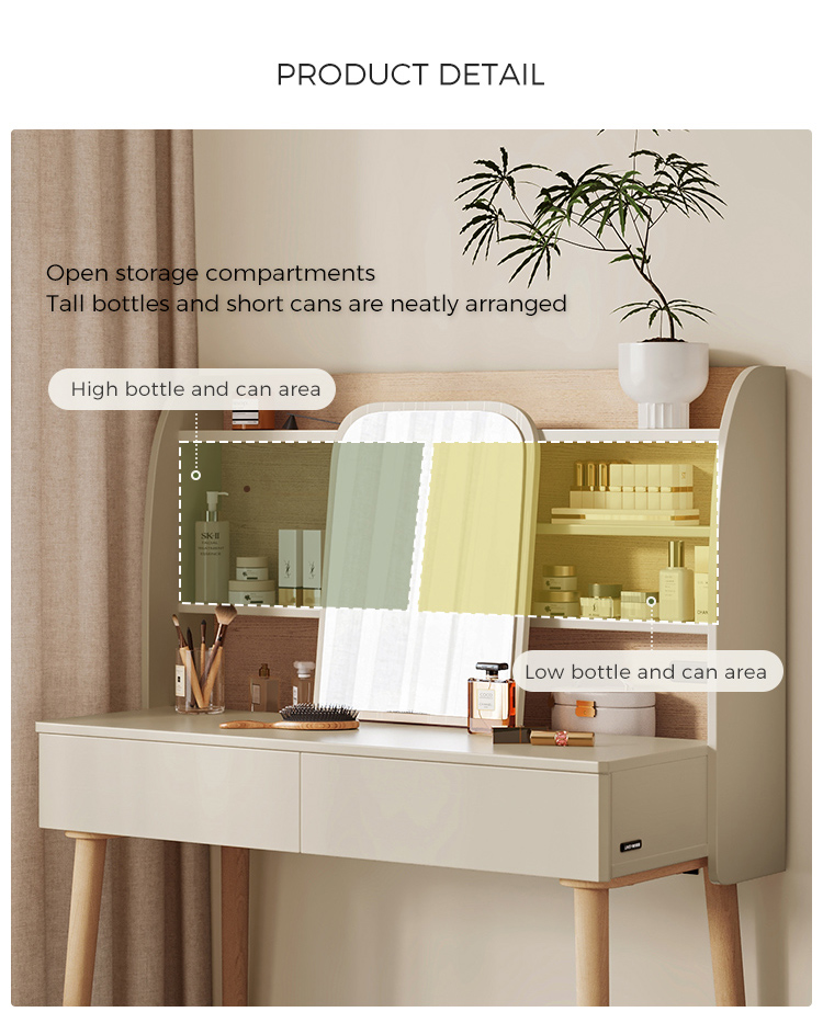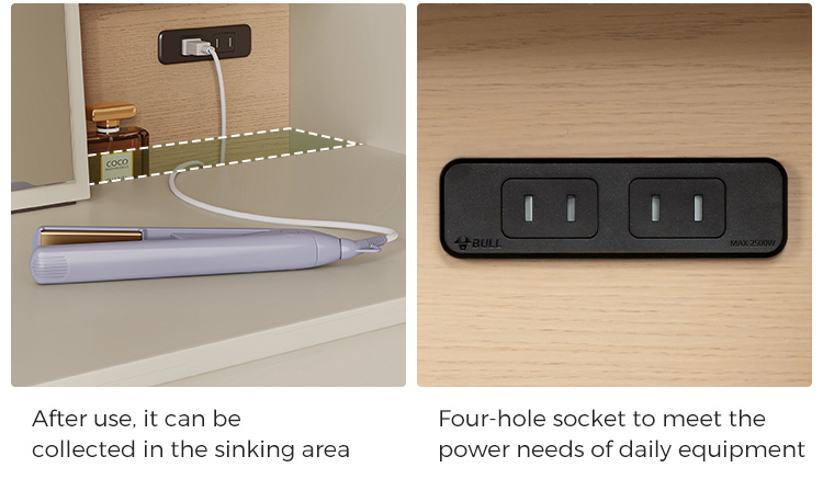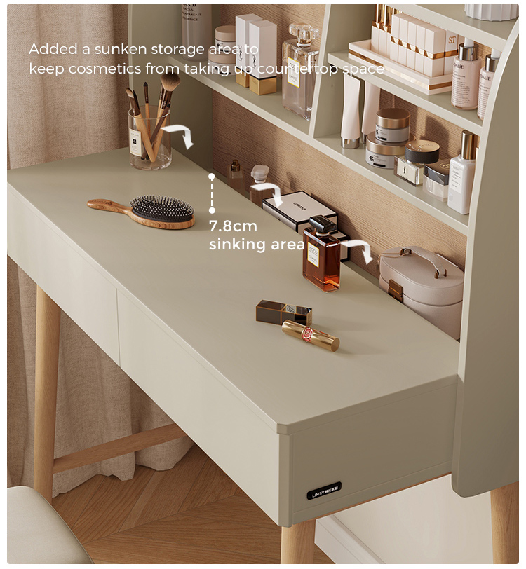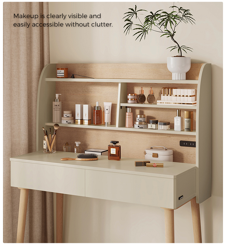 ตู้เก็บของแบบผสานรวม: ลิ้นชักที่ออกแบบอย่างพิถีพิถันช่วยให้เก็บของได้อย่างเป็นระเบียบและใช้งานได้จริง จัดเก็บเครื่องสำอาง อุปกรณ์ดูแลเส้นผม เครื่องประดับ และสิ่งของจำเป็นได้อย่างเป็นระเบียบและหยิบใช้ได้ง่ายแต่ยังคงเก็บอย่างเรียบร้อย