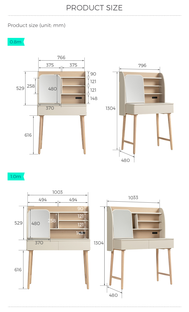 ขนาด 1 เมตรที่ปรับให้เหมาะสม (ประมาณ 39 นิ้ว): ออกแบบมาให้พอดีกับพื้นที่ขนาดเล็กหรือเป็นส่วนเสริมที่เรียบง่ายสำหรับห้องขนาดใหญ่ โต๊ะเครื่องแป้งนี้มีพื้นผิวที่กว้างขวางโดยไม่ทำให้ผังพื้นของคุณดูรก