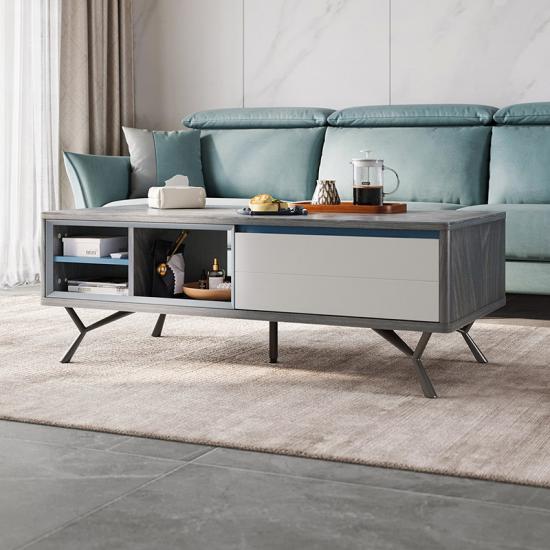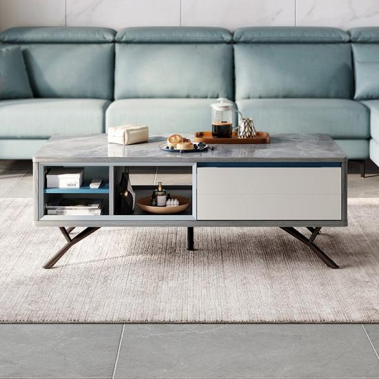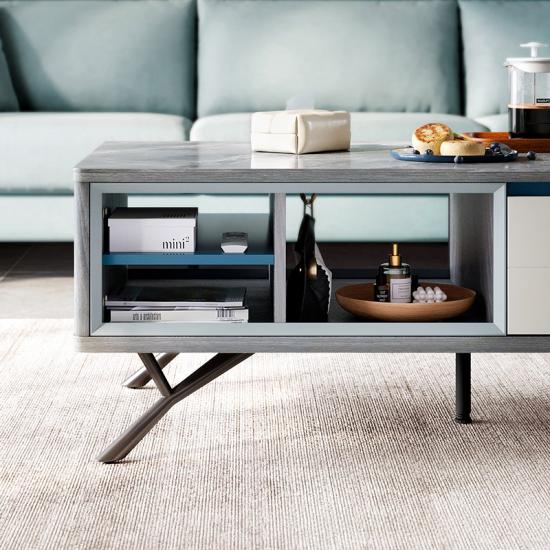 โต๊ะกลางท็อปหินอ่อนมีการออกแบบรางเลื่อนช่วยให้ดึงและถอยได้ง่าย เหมาะสำหรับผู้ที่ชื่นชอบบ้านสไตล์นอร์ดิกและการตกแต่งแบบมินิมอล
