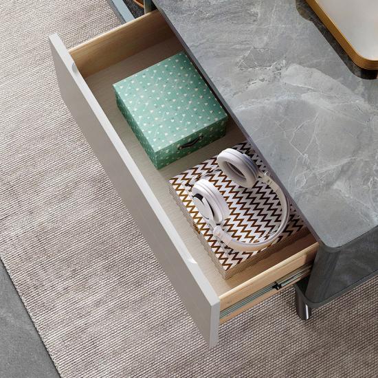 ชั้นวางทีวีท็อปหินอ่อนมีลิ้นชักขนาดใหญ่ 1 ลิ้นชัก และห้องเก็บของแบบเปิด 3 ยูนิต ซึ่งมีประโยชน์มากในการจัดเก็บและจัดระเบียบสิ่งของประจำวัน
