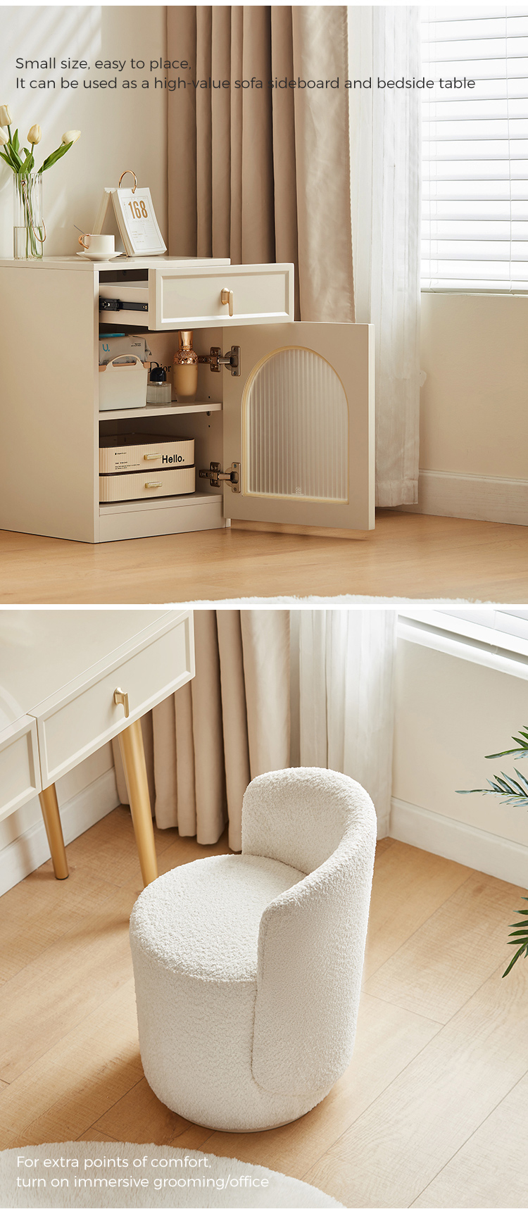 โต๊ะเครื่องแป้งอเนกประสงค์ประหยัดพื้นที่รุ่นใหม่นี้มาพร้อมกับดีไซน์ที่ขยายได้ล้ำสมัย ผลิตจากไม้คุณภาพสูงพร้อมพื้นผิวเรียบธรรมชาติและย้อมสี ชิ้นนี้ผสมผสานการใช้งานเข้ากับความสง่างามมีสไตล์ จึงเป็นตัวเลือกที่สมบูรณ์แบบสำหรับห้องนอน