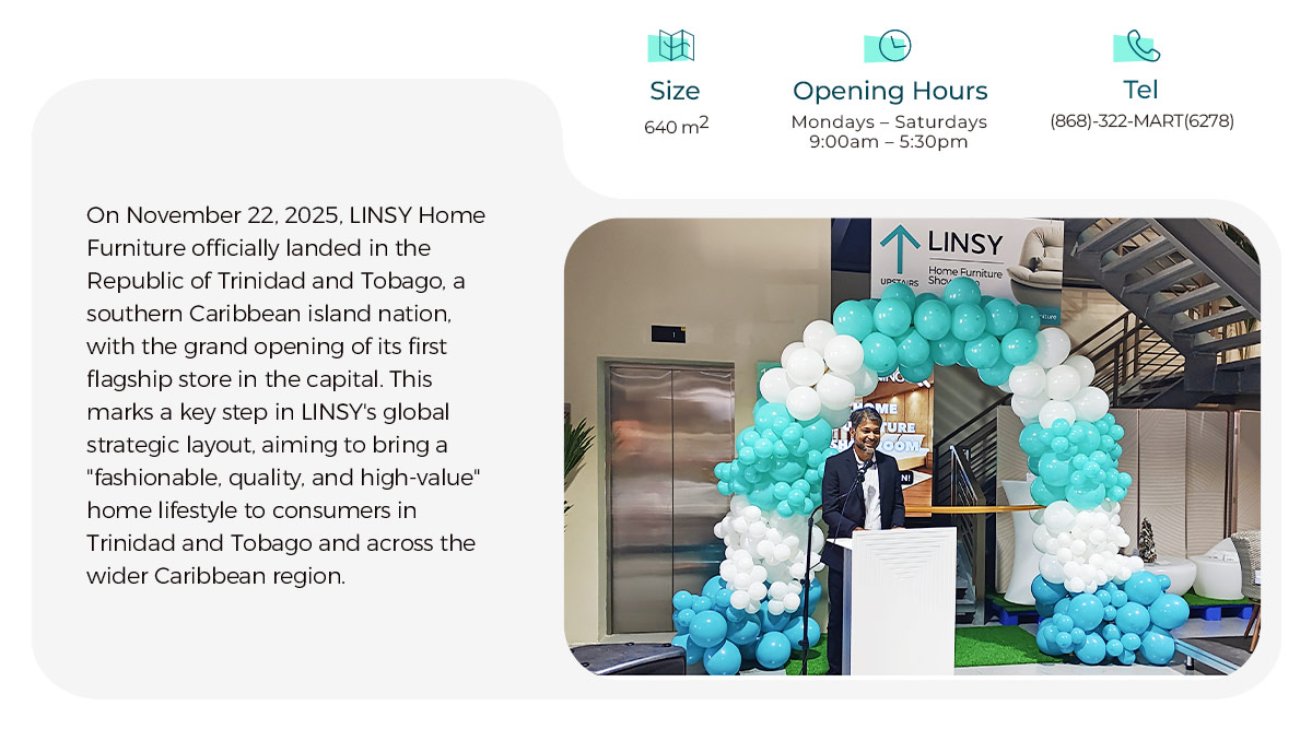 On November 22, 2025, LINSY HomeFurniture officially landed in the Republic of Trinidad and Tobago, asouthern Caribbean island nation,with the grand opening of its firstflagship store in the capital. This marks a key step in LINSY's globalstrategic layout, aiming to bring a'fashionable, quality, and high-value"home lifestyle to consumers in Trinidad and Tobago and across the wider Caribbean region.