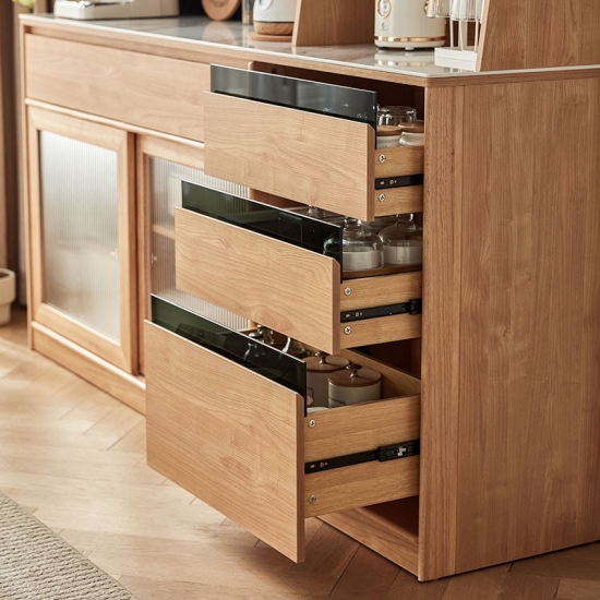 หยิบตู้พื้นลิ้นชักไม้นี้แทน ตู้นี้ทำจากไม้เนื้อแข็ง แข็งแรง ทนทาน ใช้งานได้นานหลายปี ให้สัมผัสที่ทันสมัย นอกจากนี้ ลิ้นชักยังประดับด้วยลูกบิดโลหะสีทองเพื่อสัมผัสที่หรูหรา