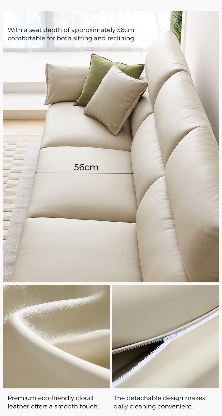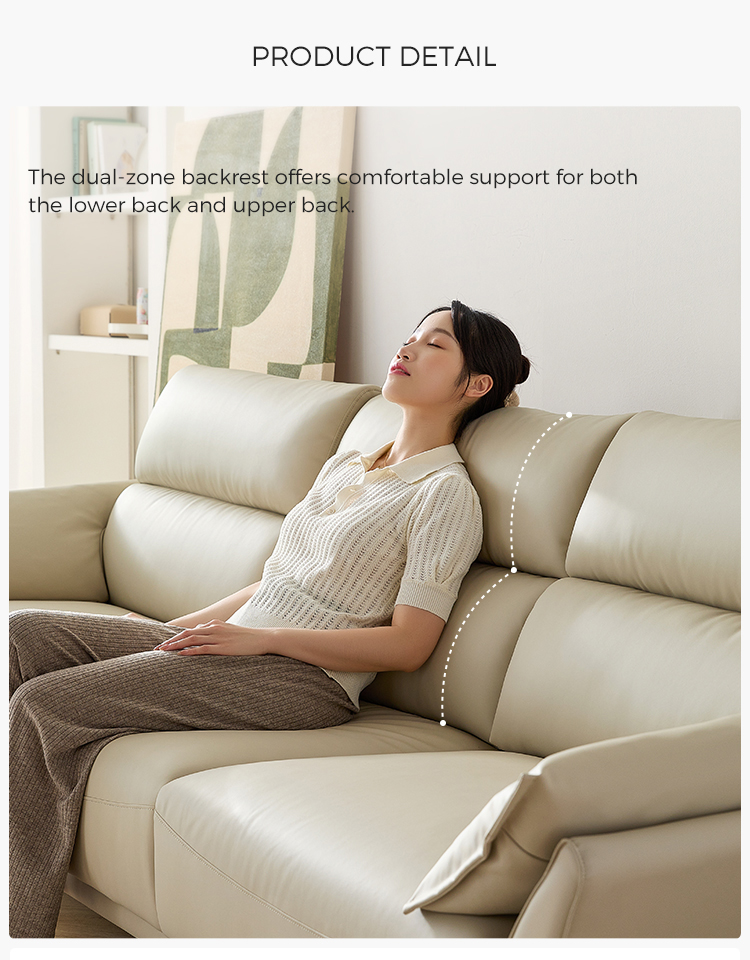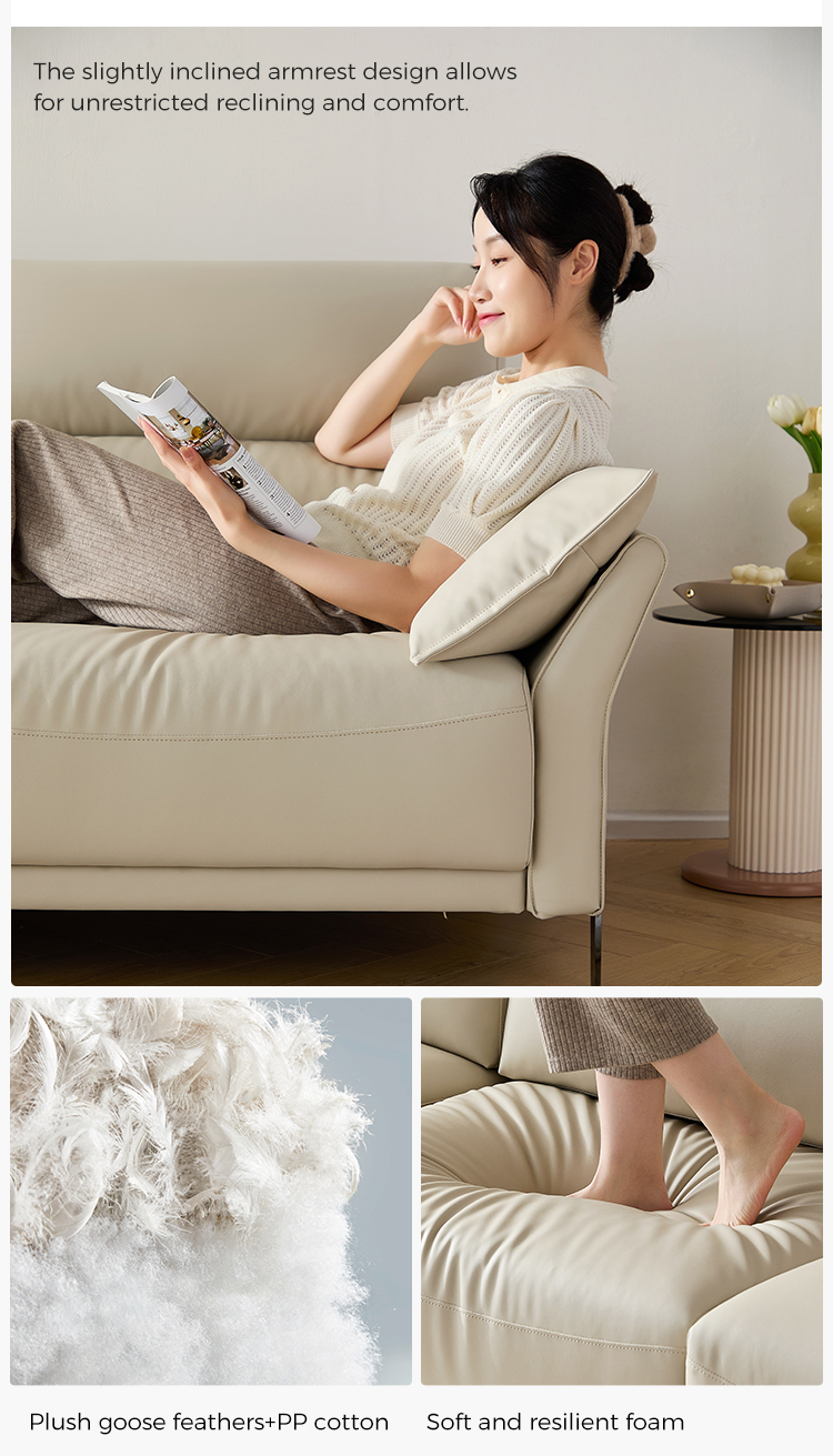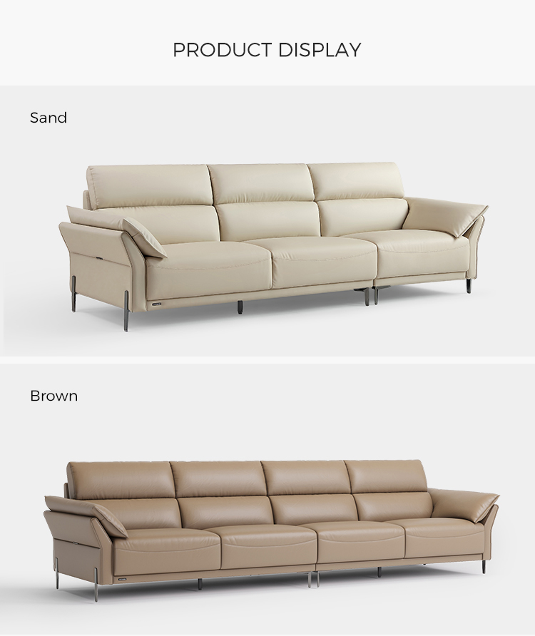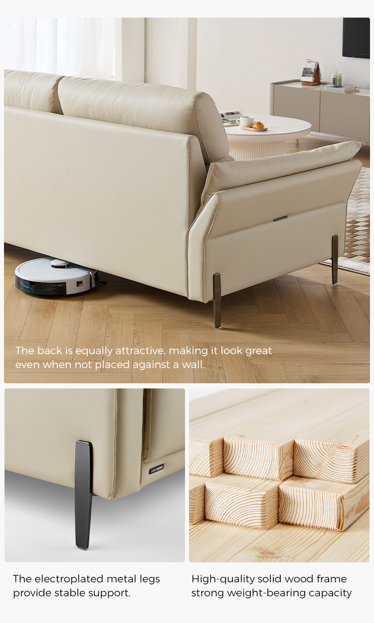 โซฟาร่วมสมัยนี้มีสไตล์ทันสมัยพร้อมรูปลักษณ์ที่สวยงาม ตัดเย็บจากโครงไม้ โดดเด่นด้วยทรงไม่หุ้มข้อพร้อมแขนทักซิโด้และส่วนหลังจับจีบเป็นช่อง มีความสมดุลบนขาโลหะสี่ขาที่เรียวและกางออก พร้อมเคลือบสีทองส่องสว่างซึ่งเพิ่มสัมผัสที่ดี เต็มไปด้วยโฟมเนื้อนุ่มเหนือสปริงที่คดเคี้ยว และหุ้มด้วยหนังแท้ที่มีเฉดสีเข้มและเนื้อสัมผัสที่เนียนนุ่ม