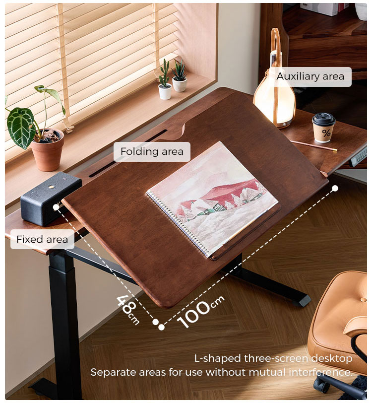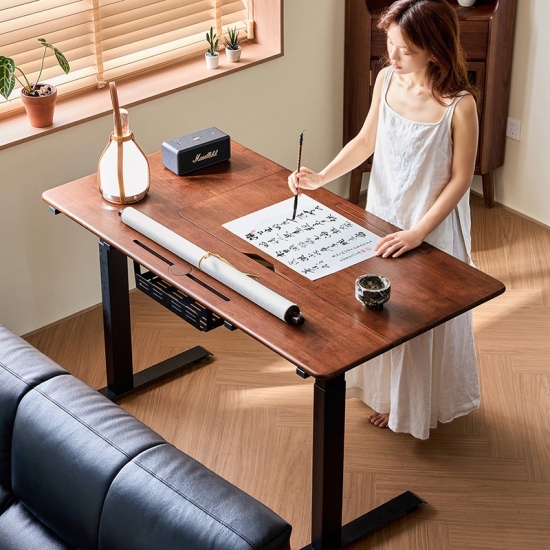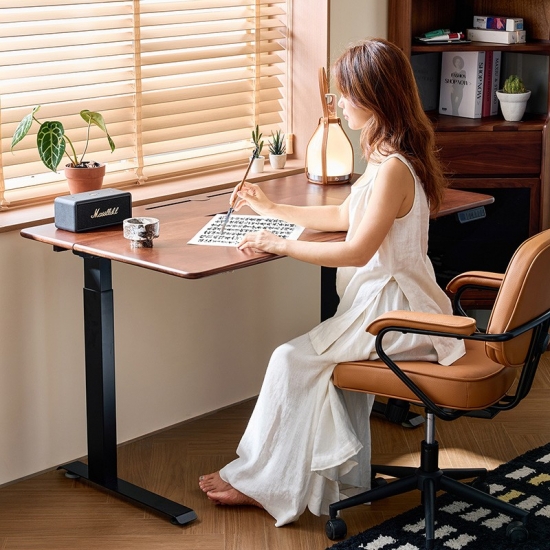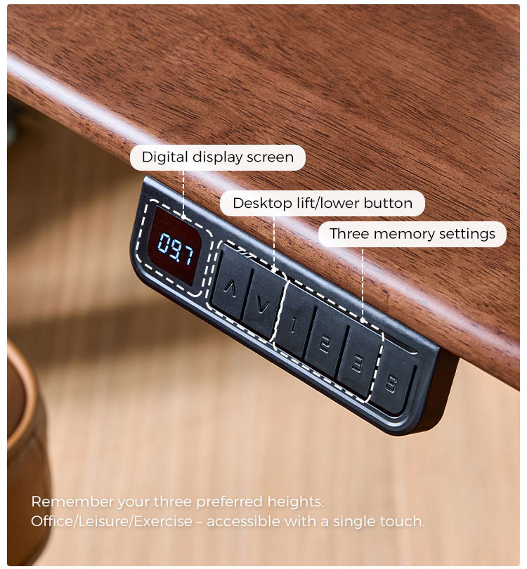 สัมผัสประสบการณ์ความยืดหยุ่นที่ลงตัวด้วยโต๊ะยืนทำงานไฟฟ้าของเรา ปรับความสูงของพื้นที่ทำงานได้อย่างง่ายดายด้วยมอเตอร์ที่เงียบสนิท พื้นผิวไม้สีวอลนัทอบอุ่นมอบความสง่างามอย่างเป็นธรรมชาติให้กับทุกห้อง ช่วยส่งเสริมความสะดวกสบายและประสิทธิภาพในการทำงานตลอดทั้งวัน