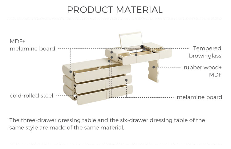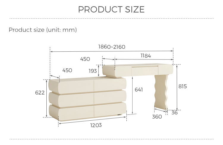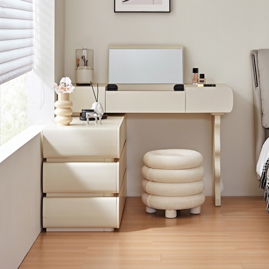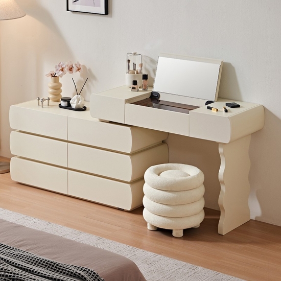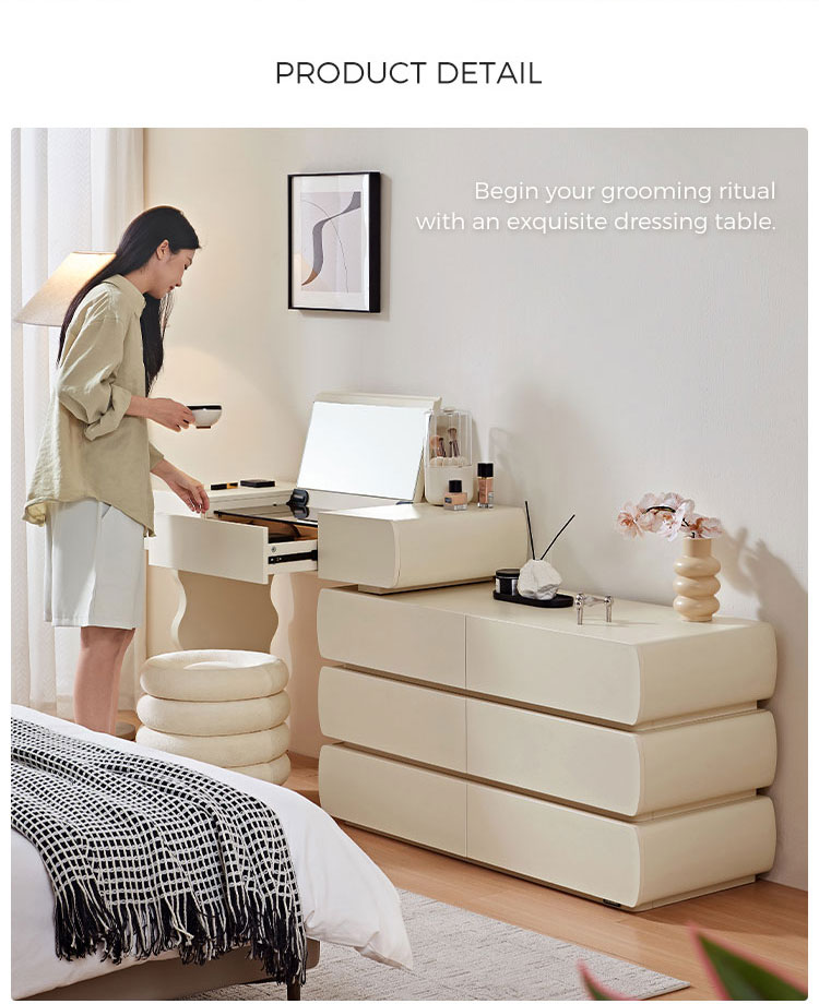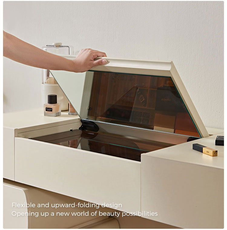 ดีไซน์ที่ลงตัว: ด้วยเส้นสายที่เรียบง่ายและการตกแต่งคุณภาพสูง โต๊ะเครื่องแป้งนี้จึงเปล่งประกายความสง่างามเหนือกาลเวลา การออกแบบที่กลมกลืนทำให้กระจก ลิ้นชัก และกรอบทำงานร่วมกันเพื่อสร้างจุดเด่นแห่งความหรูหราที่ประณีต