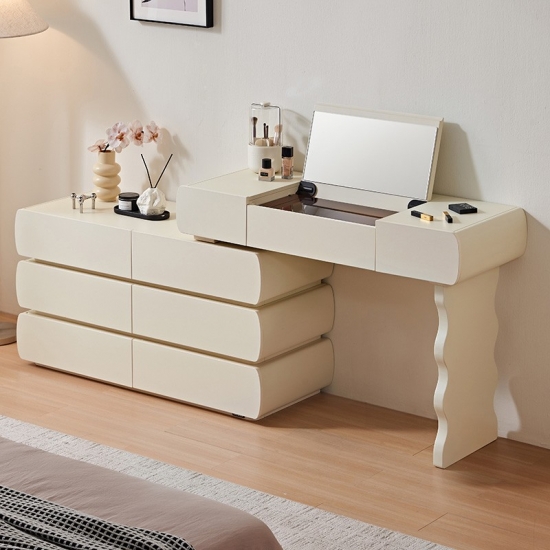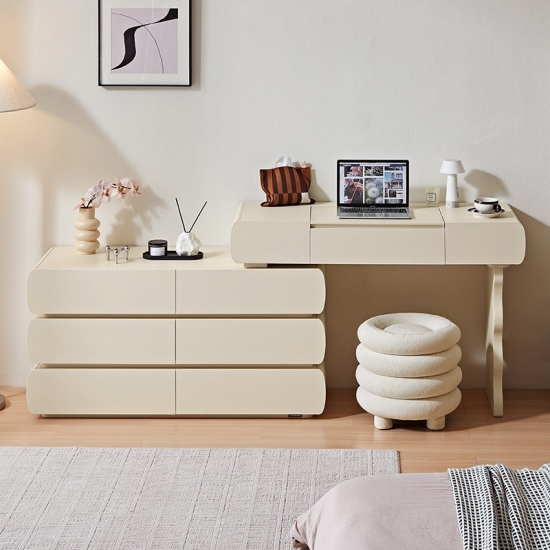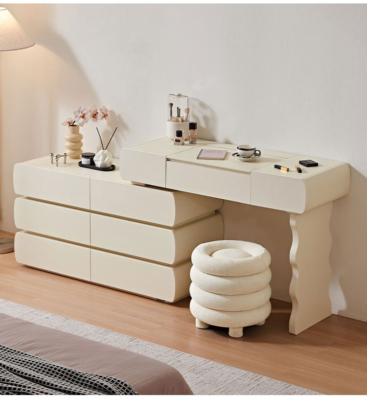 วิธีแก้ปัญหาที่ประหยัดพื้นที่: การรวมตู้ลิ้นชัก โต๊ะเครื่องแป้ง และกระจกไว้ในชิ้นเดียว ช่วยเพิ่มฟังก์ชันการใช้งานและเพิ่มประสิทธิภาพการจัดวางพื้นที่ในห้องนอนของคุณ