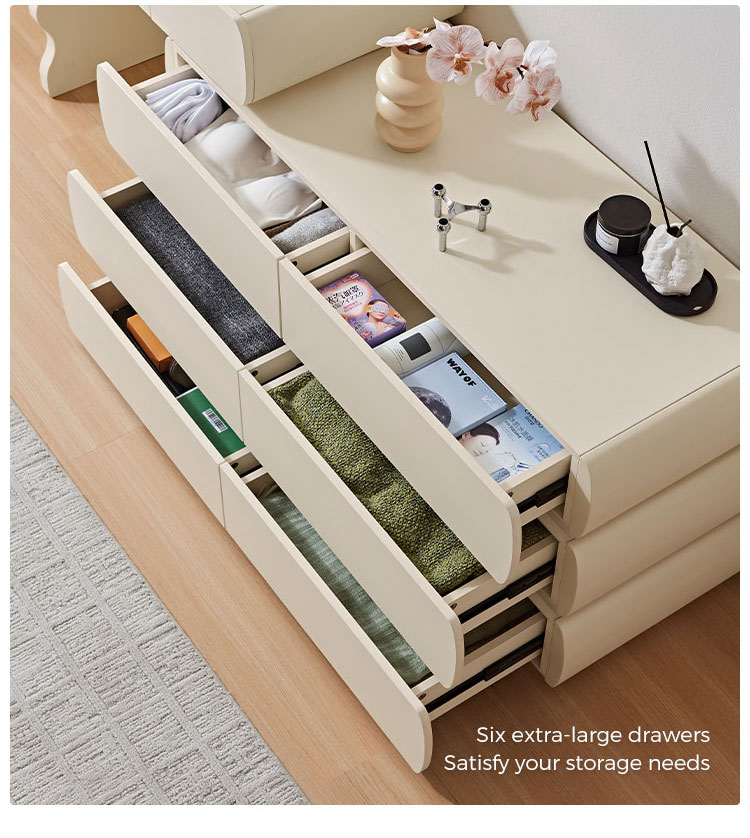 ยกระดับกิจวัตรประจำวันและสุนทรียภาพในห้องนอนของคุณด้วยตู้ลิ้นชัก 6 ช่องพร้อมกระจก RI2C-B สุดหรูชิ้นนี้ เฟอร์นิเจอร์อเนกประสงค์ชิ้นนี้ผสมผสานพื้นที่จัดเก็บมากมาย มุมแต่งหน้า และสไตล์ที่หรูหราได้อย่างลงตัว ด้วยลิ้นชัก 6 ช่องที่เลื่อนได้อย่างราบรื่น ตู้ลิ้นชักนี้จึงมีพื้นที่กว้างขวางสำหรับจัดเก็บเสื้อผ้า เครื่องประดับ ผ้าปูที่นอน หรือของใช้จำเป็นด้านความงาม เก็บสิ่งของของคุณให้เป็นระเบียบเรียบร้อยแต่ก็หยิบใช้ได้ง่าย นี่คือตัวเลือกที่ดีสำหรับบ้านของคุณ